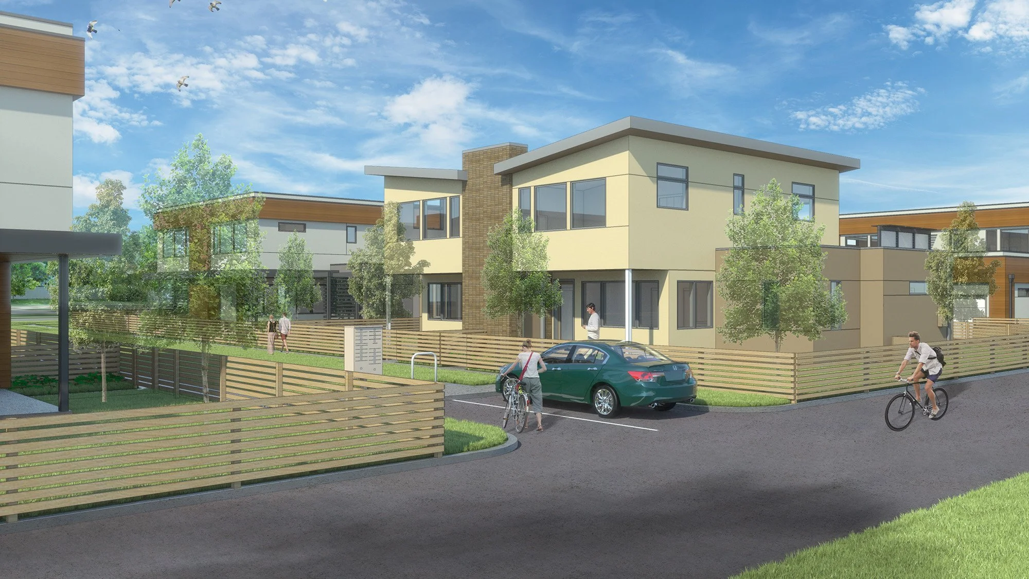 Canyon Creek is a residential infill project located in Erie, Colorado. The site is zoned for medium-density housing, and Sopher Sparn Architects led the team in designing and obtaining approval for the project from the Town of Erie. The project consists of six buildings, each containing twelve paired homes that are approximately 1800 square feet each. The homes are designed to be energy-efficient and feature low-maintenance exterior finishes. Additionally, half of the homes will have rooftop decks above the garage, providing additional private outdoor space.